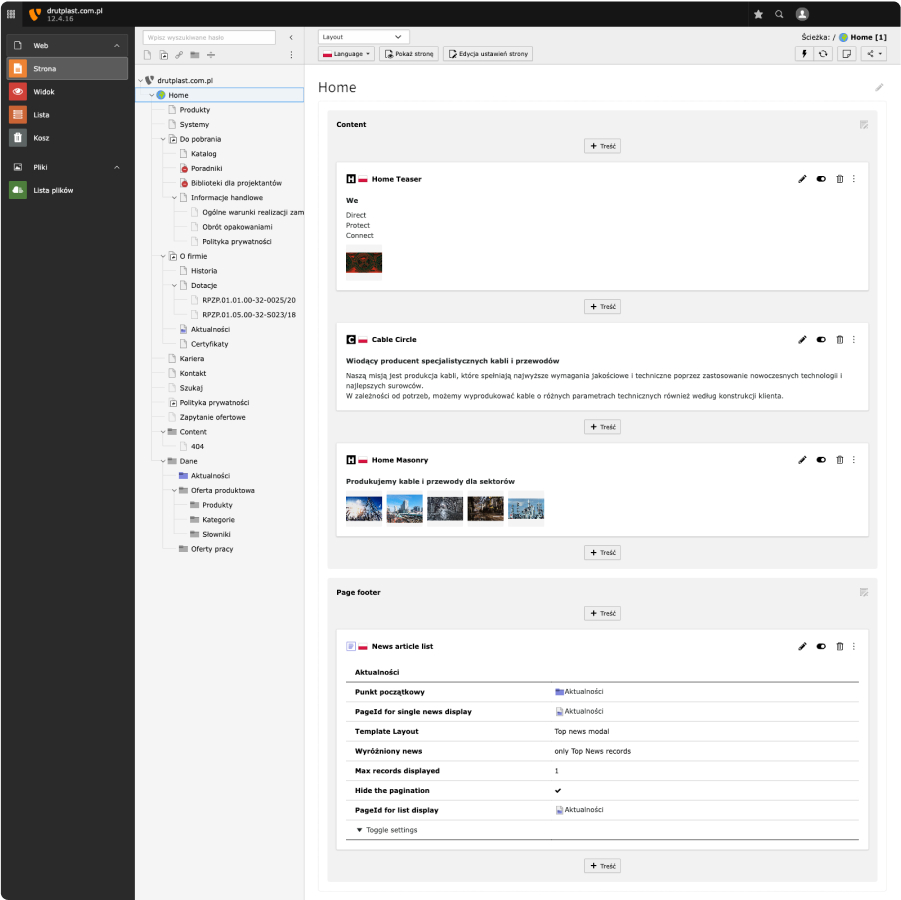 Elastyczność systemu umożliwiła integrację z CRM oraz stworzenie dedykowanego modułu składania zapytań ofertowych, zapewniając płynność działania i intuicyjną obsługę zarówno dla administratorów, jak i użytkowników końcowych. TYPO3 to gwarancja stabilności i wydajności, która wspiera codzienne funkcjonowanie serwisu na najwyższym poziomie.