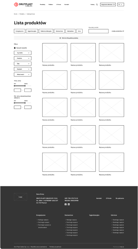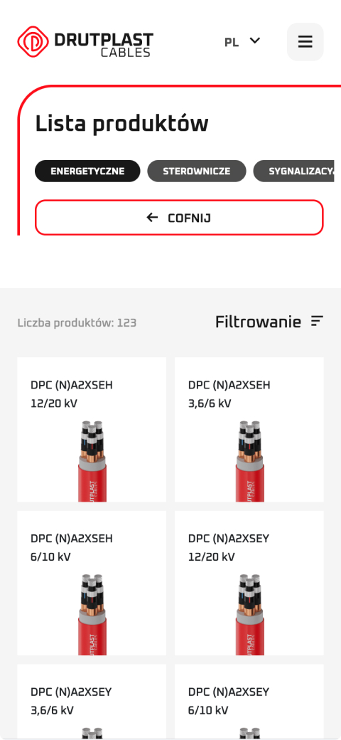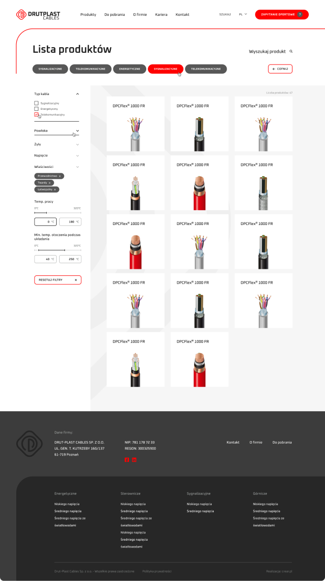 System filtrowania listy produktów został zaprojektowany z myślą o precyzyjnym dopasowaniu wyników do wymagań klientów. Umożliwia on przeszukiwanie oferty według kluczowych parametrów, takich jak typ przewodu, zastosowanie czy specyfikacja techniczna.