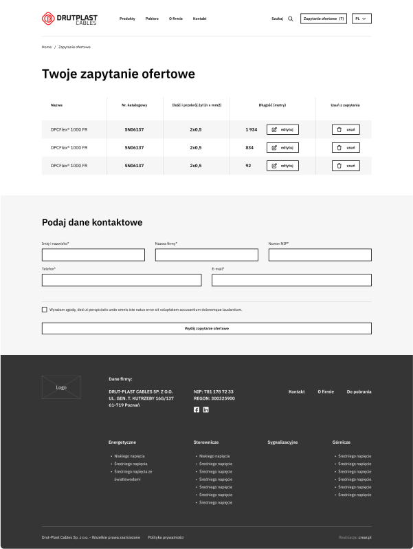 Całość dopełniają wyraźnie rozmieszczone elementy CTA, które prowadzą do dedykowanego systemu zapytań ofertowych.
