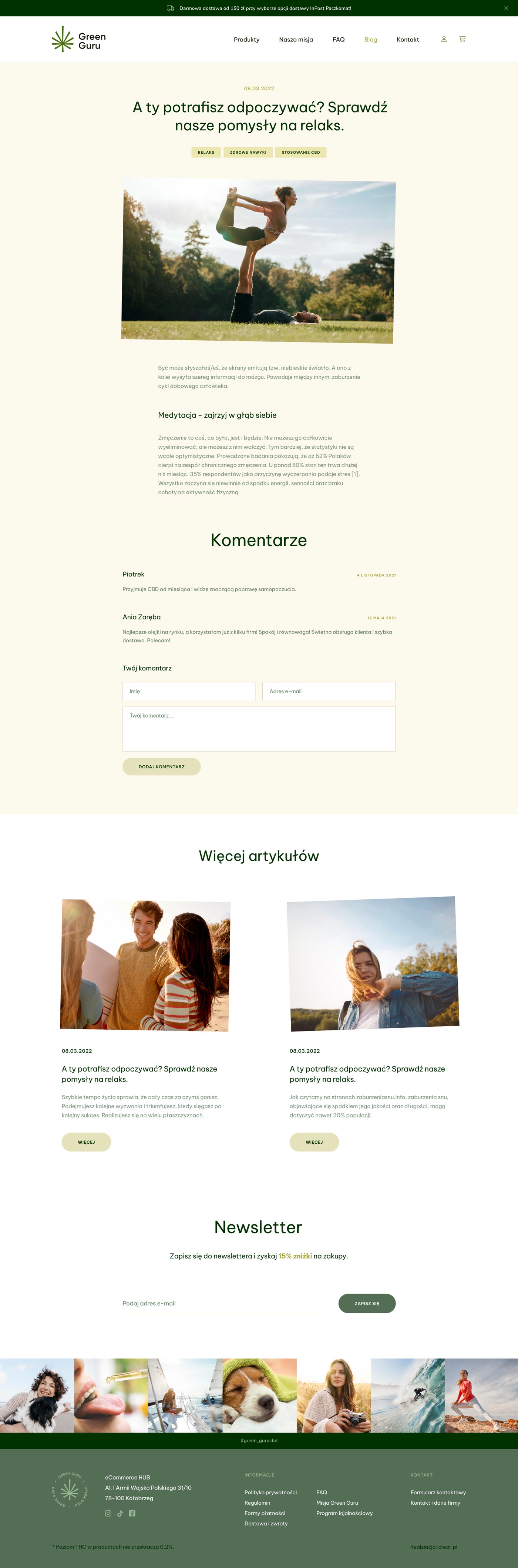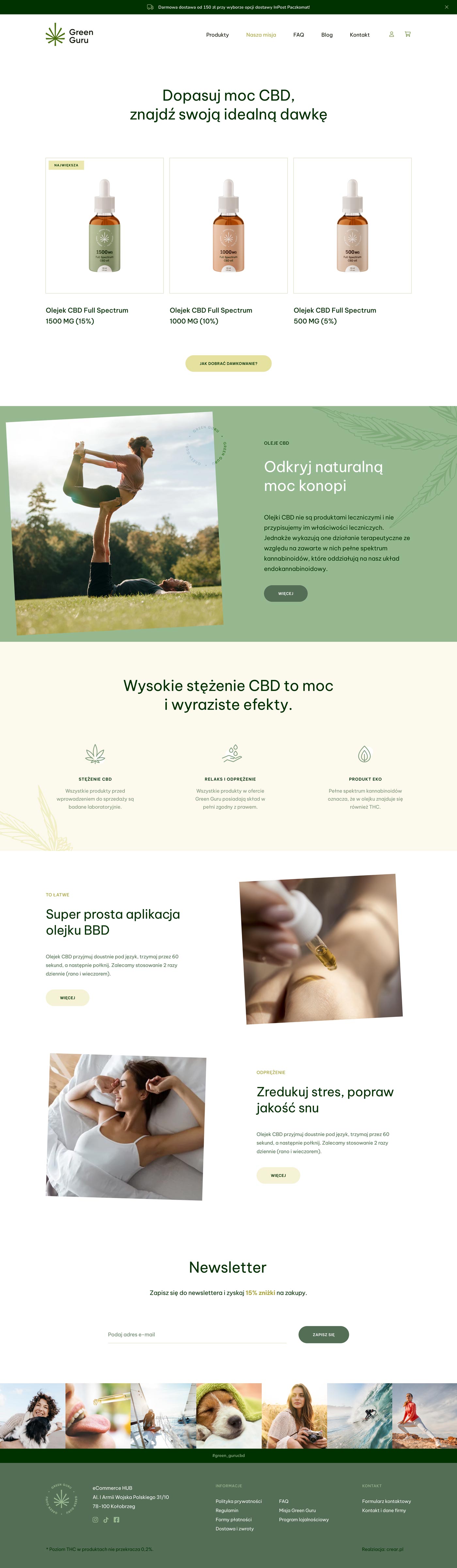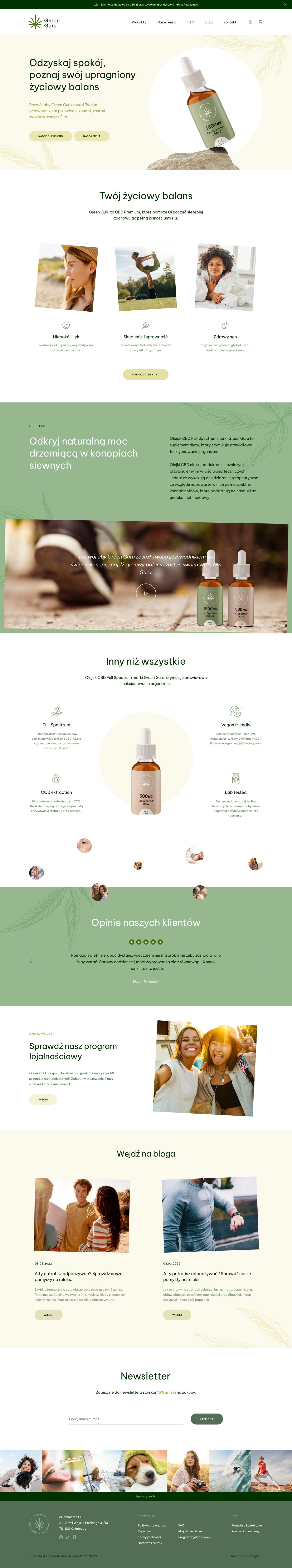 Stonowana kolorystyka strony nawiązująca do harmonii z naturą w pełni oddaje charakter produktów marki GreenGuru. Przemyślany układ treści oraz intuicyjna nawigacja pomaga poruszać się po witrynie. Produkty pokazane w przejrzysty, a zarazem ciekawy sposób, zachęcają do zakupu. Sklep oferuje szybkie metody płatności oraz integracje firm kurierskich. Zoptymalizowany proces składania zamówień oraz specjalny system poleceń to dodatkowe atuty strony.